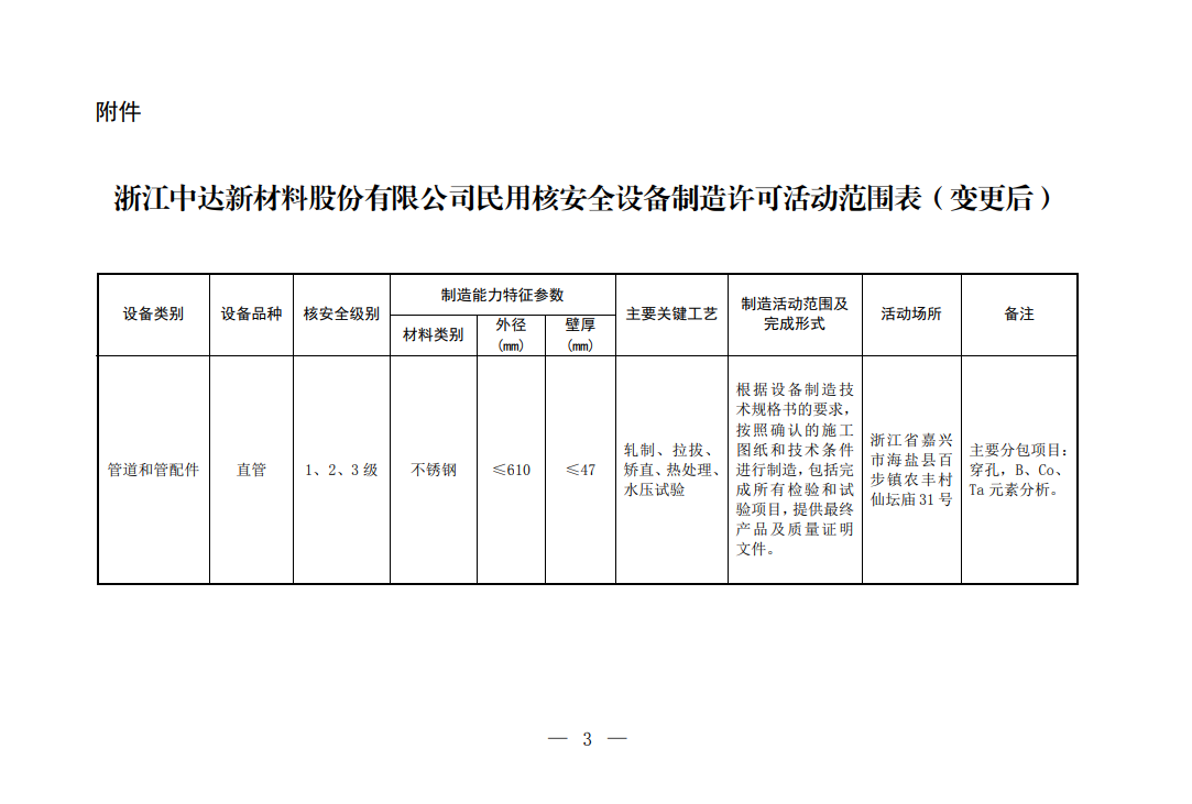 The nuclear safety level of the certificate has been changed from the original level 2 and 3 to level 1, 2 and 3, and the manufacturing capacity parameters have been changed from the outer diameter ≤ 220mm, the wall thickness ≤ 10mm to the outer diameter ≤ 610mm, and the wall thickness ≤ 47mm.
